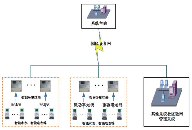 綜合能耗監測系統針對園區內各建筑用電、用水及冷/熱量等進行能效綜合管理,包括建筑能耗綜合管理系統和水電冷熱表采集系統。水電冷熱表采集系統實現對園區各建筑各類用能數據的實時采集與上傳;建筑能耗綜合管理系統接收水電冷熱表采集系統上傳的用能數據,實現對園區各建筑各類用能數據的存儲、計算及應用,系統采用B/S架構,將分析展現的結果通過園區局域網進行訪問。