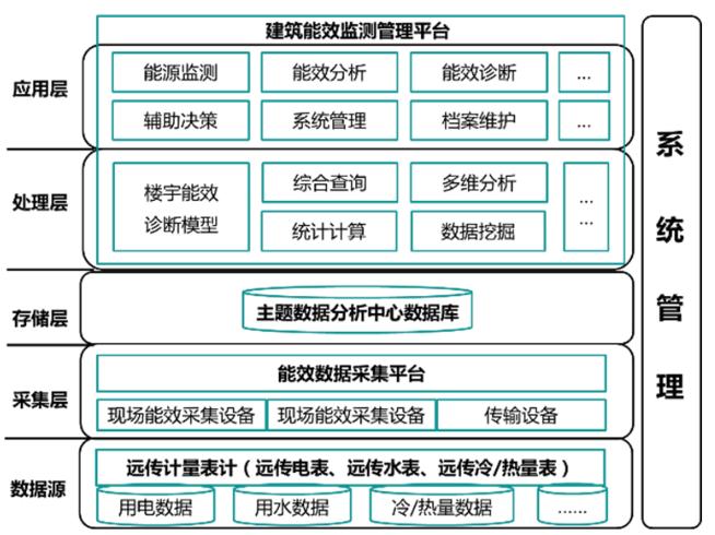 如圖1所示,綜合能耗監測系統框架包括功能應用層、邏輯處理層、數據存儲層、數據采集層、數據源五層架構。其中,功能應用層包括能源監測、能效分析、能效診斷、輔助決策以及檔案維護、系統管理等用戶功能,通過多維度、可視化的系統功能界面實現與用戶的信息互動;邏輯處理層通過建立能耗評估模型,并利用數據挖掘、統計計算、多維分析等手段對能耗數據進行分析,為功能應用層提供直接的數據支持;數據存儲層利用主流結構化數據庫對能耗數據進行分類存儲,提高邏輯處理層的處理性能;數據采集層利用終端采集設備實現對智能電表、智能水表和智能冷熱計量表等遠傳終端的數據源采集,為整個綜合能耗監測系統提供基礎數據支撐。