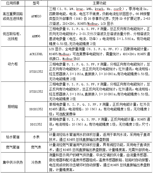 用電類:采集采暖、鍋爐、空調、制冷、照明、辦公、電梯、水泵、風機、通風機等耗電設備的用電信息。主要監測其用電量,對于大耗電設備監測其電流、電壓及功率因數等信息。