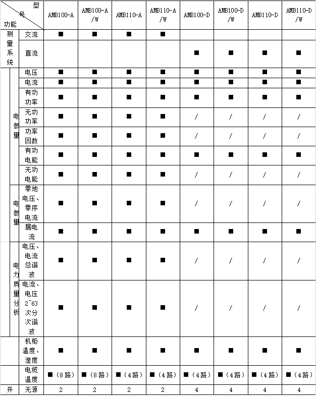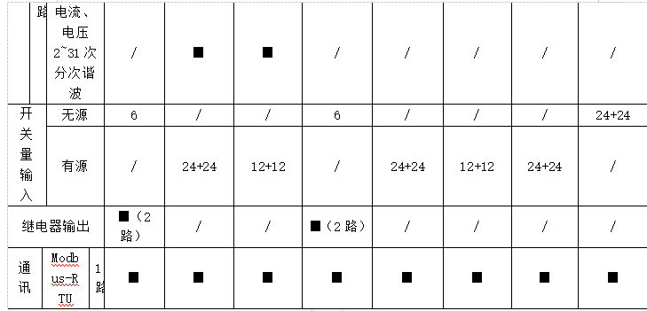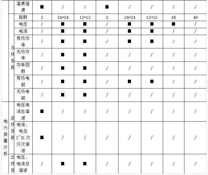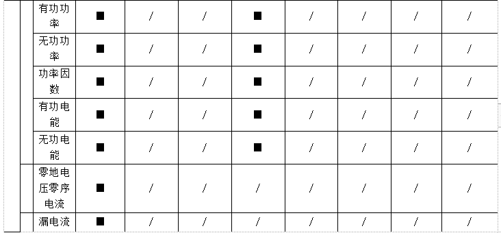 遙測:三相電壓、電流、有功功率、無功功率、視在功率、功率因數、有功電能、無功電能、電纜溫度,系統頻率、零序電流、零地電壓、漏電流、機柜溫度、機柜濕度、開關狀態、電壓/電流諧波含量、電流/功率;