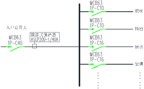 ASCP200-1型電氣防火限流式保護器建議安裝在入戶開關下端,額定電流值根據入戶開關的具體規格進行設置,典型應用示意圖如圖3所示: